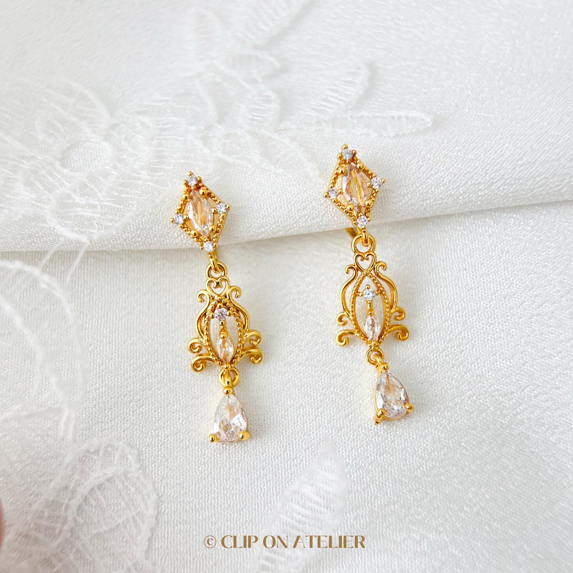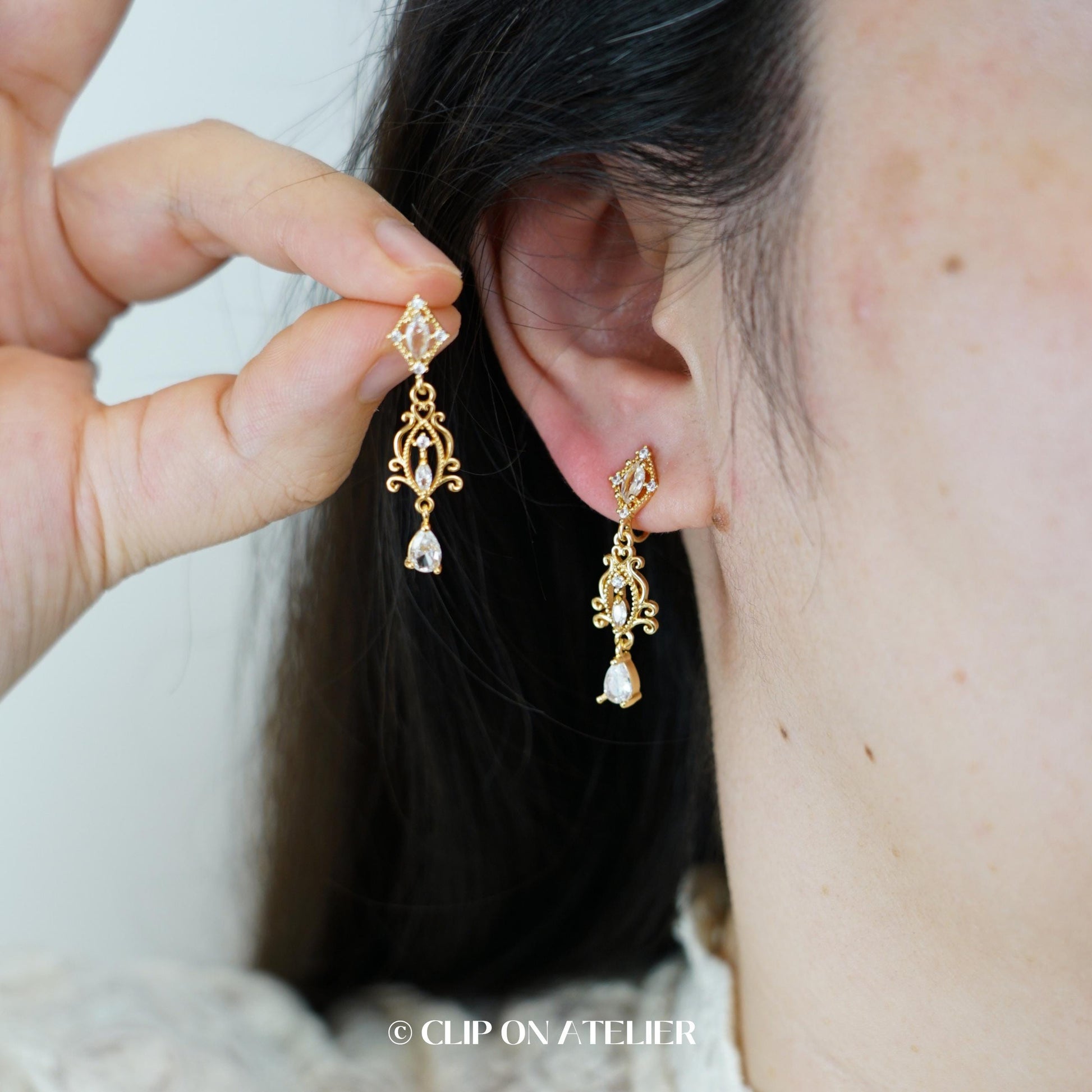 * Turn heads with these dazzling Art Deco–inspired CZ diamond drop clip-on earrings — dainty, timeless, and designed to deliver effortless sparkle without the need for piercings.