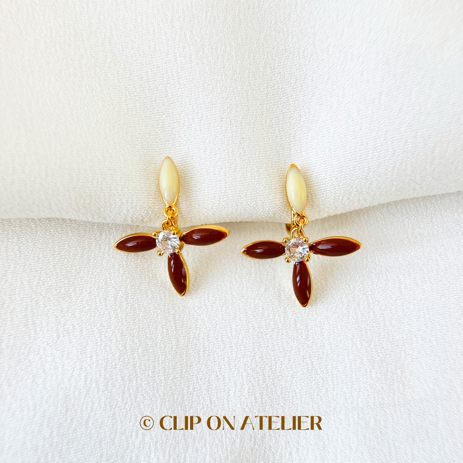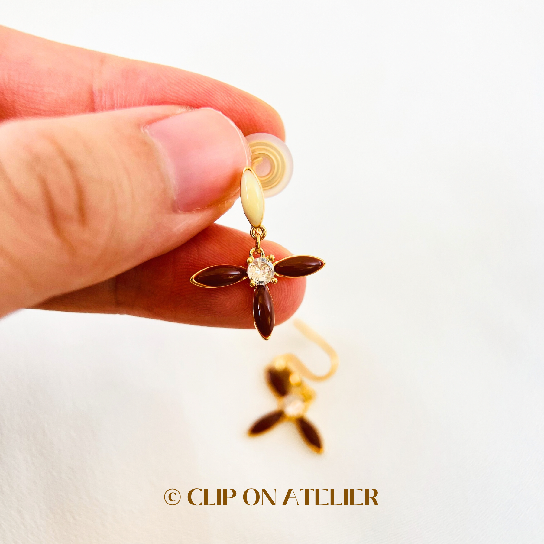 Brown Clover Flower Enamel Lucky Hoop Drop Clip On Earrings