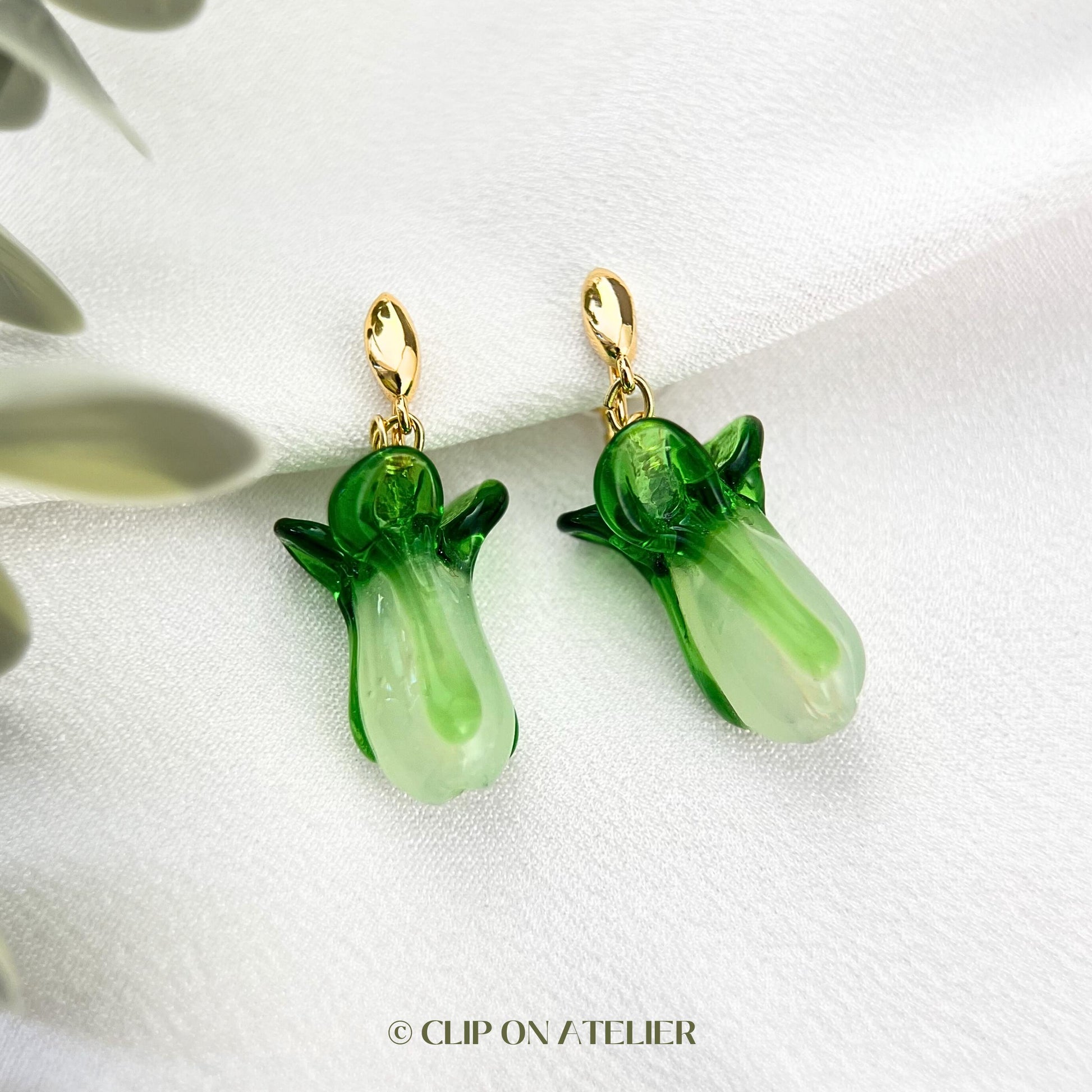 Clip On Earrings Green Vegetable Bok Choy Cute Earring Ear Clips | Pain Free Clip Coil | Non Pierced Ears | Christmas Jewelry Gift Kid Her