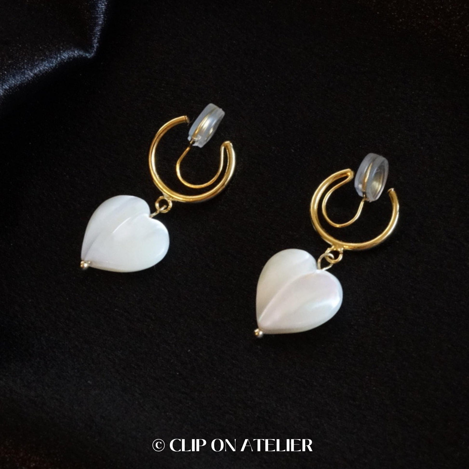 Mother of Pearl Heart Gold Hoop Clip On Earrings