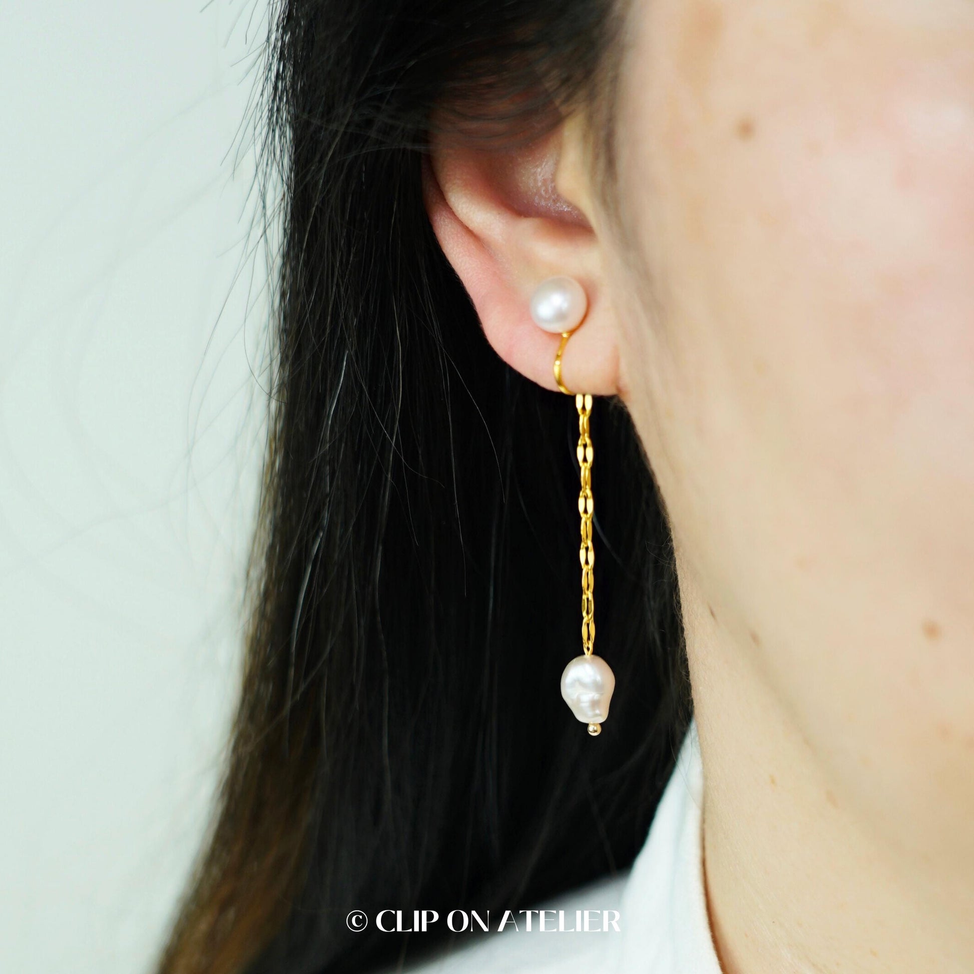 These clip-on drop ear jacket earrings feature a lustrous 6–7 mm round pearl at the front and a fine link chain with a 7–8 mm baroque pearl drop at the back, creating a refined layered silhouette. The minimalist design offers graceful movement and a perfectly balanced look, ideal for effortless elegance.