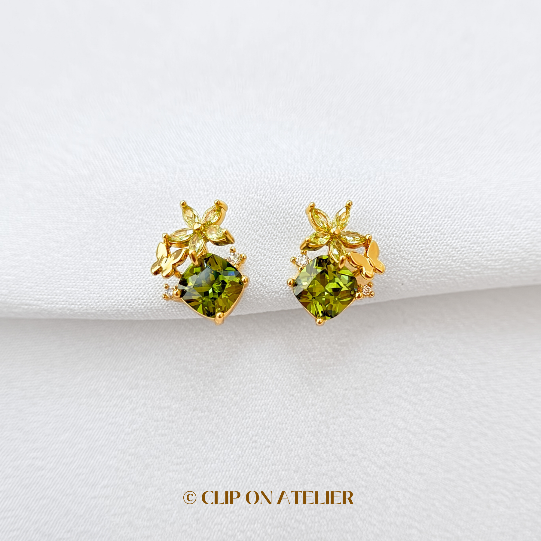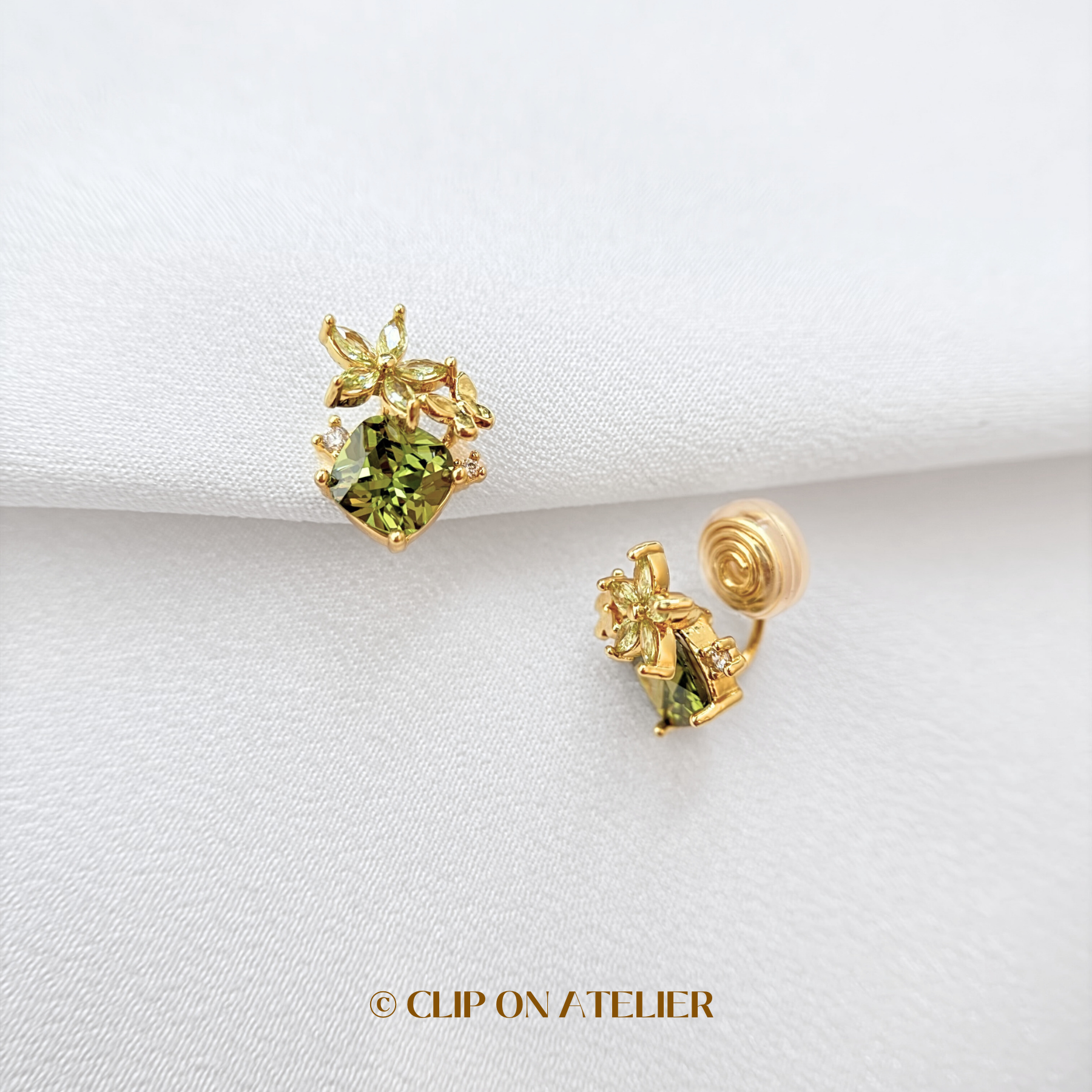 Dainty Green CZ Diamond Floral Clip On Earrings